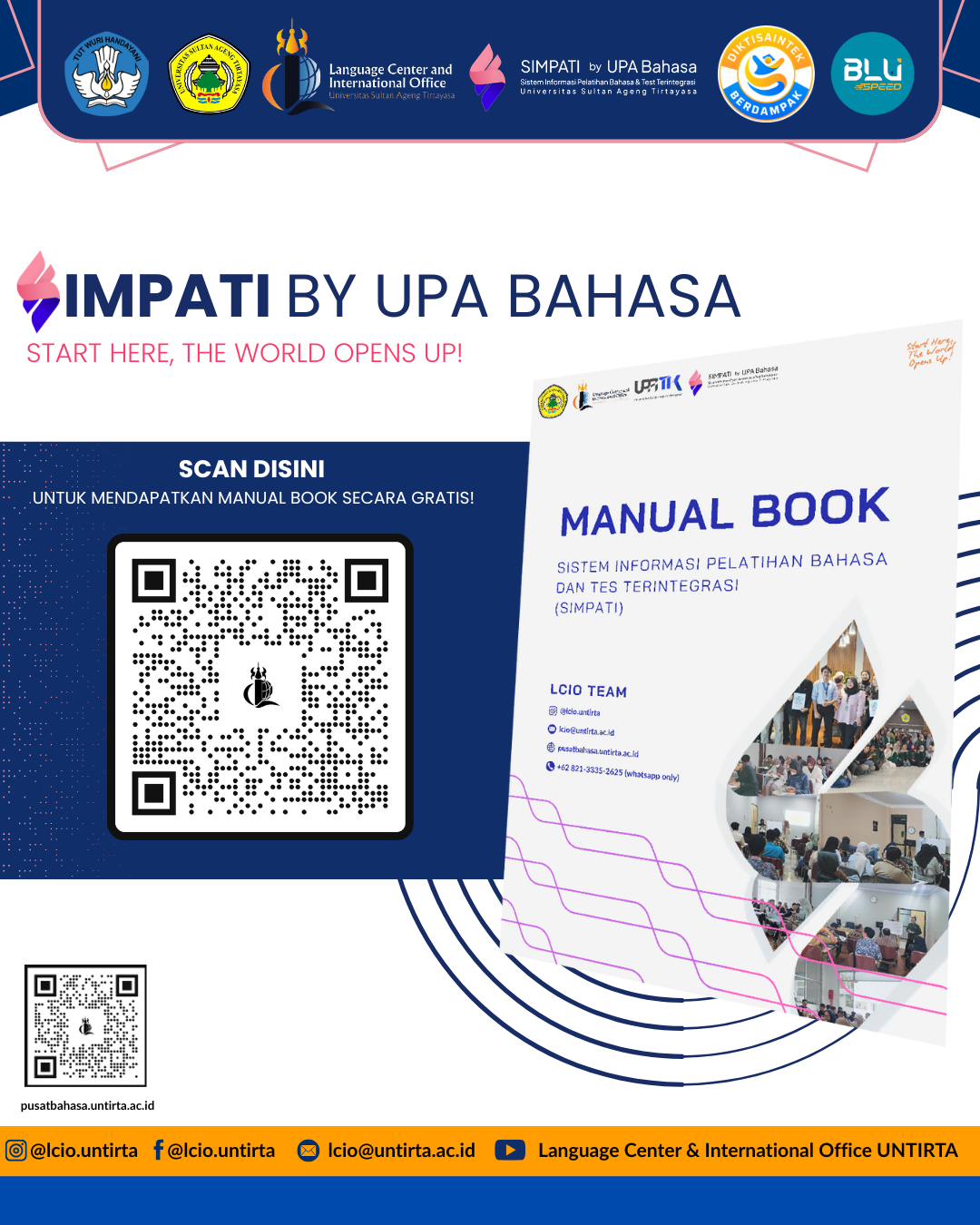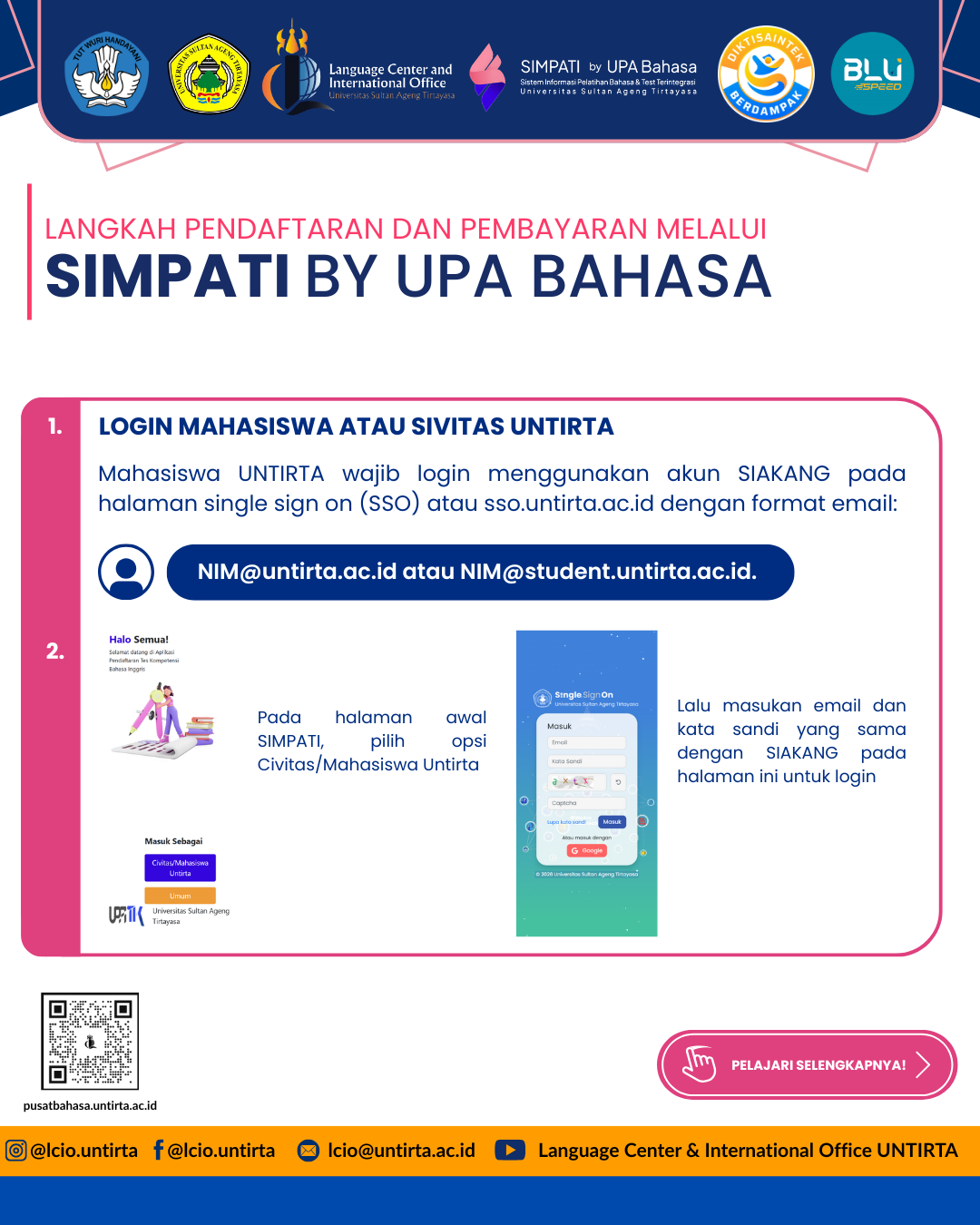The Integrated Language Training and Testing Information System (SIMPATI), developed for UPA Bahasa at Universitas Sultan Ageng Tirtayasa (Untirta), provides an efficient platform for language training and testing. It allows students and the public to register for language courses, take integrated tests, access results, and receive certificates, all through a user-friendly interface, promoting easy access to language proficiency improvement.